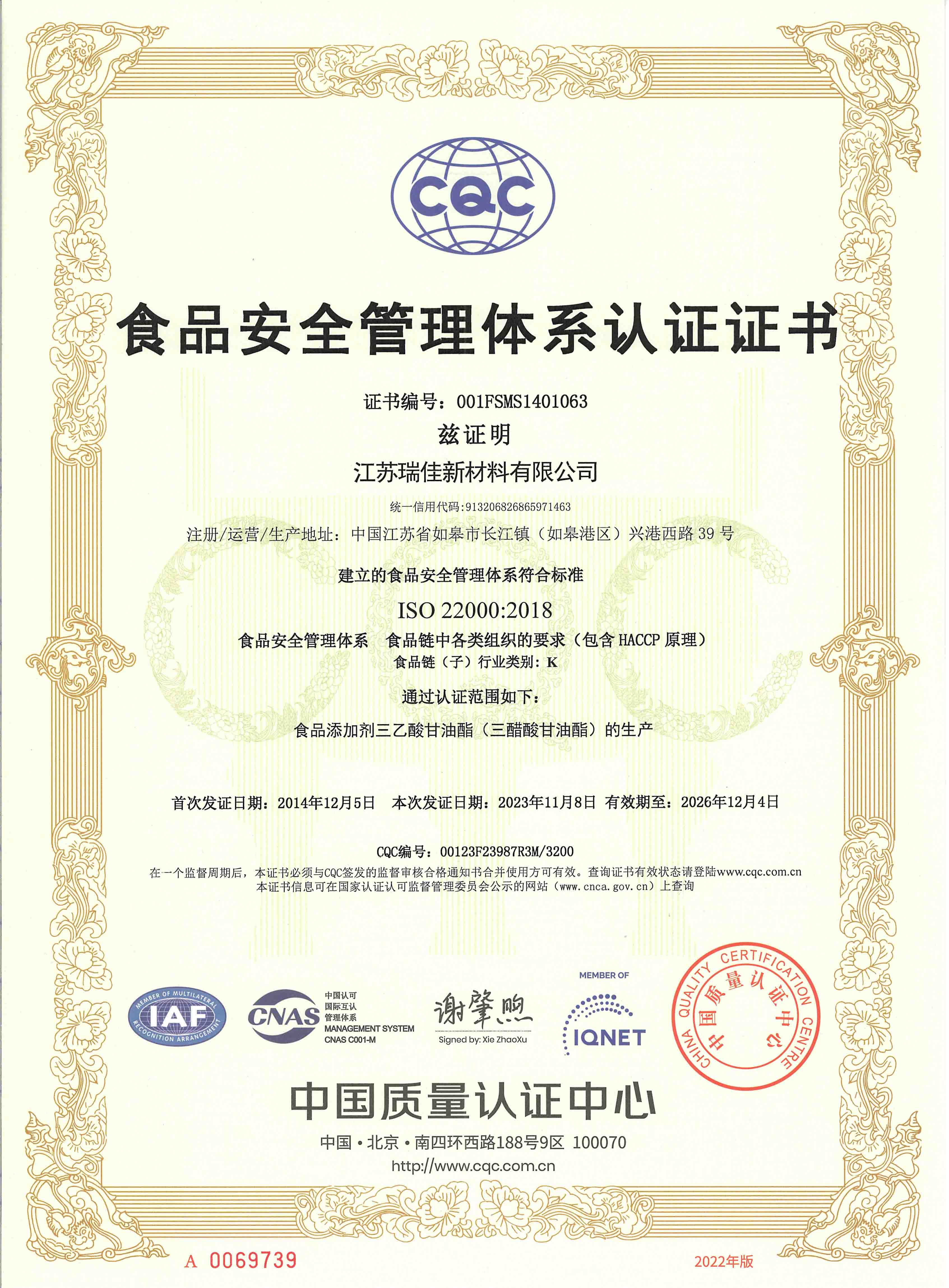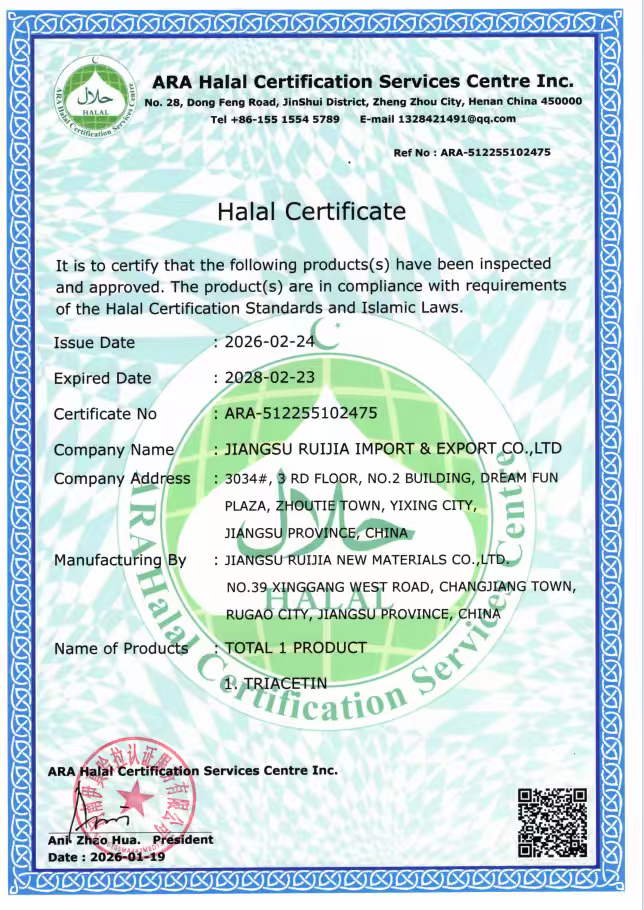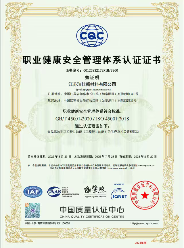 公司秉承“以質(zhì)為本,以誠取信”的經(jīng)營理念,具有完善的質(zhì)量、環(huán)境、安全體系,通過ISO9001、ISO14001、ISO22000等體系認證。主要出口產(chǎn)品三乙酸甘油酯通過KOSHER、HALAL認證,完成了FDA和REACH的正式注冊。