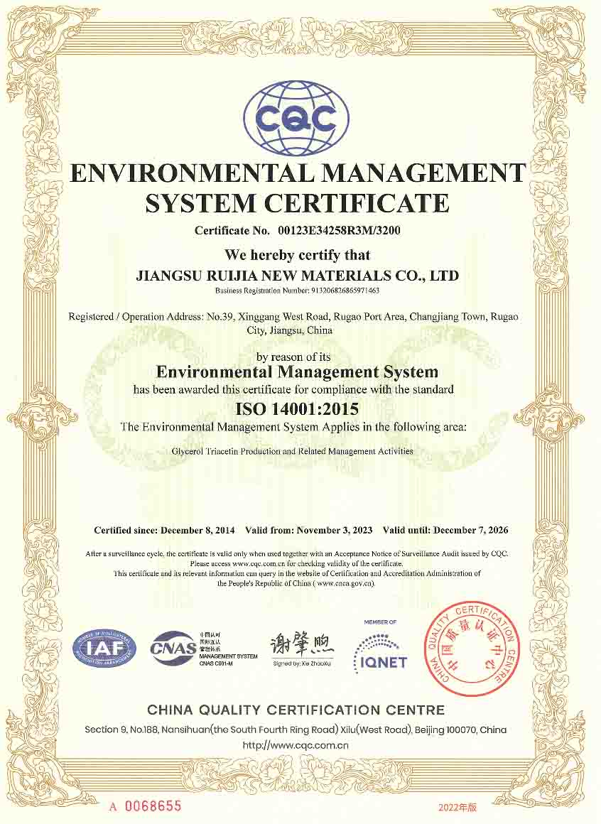 Jiangsu Ruijia New Material Co., Ltd. (former Jiangsu Ruichen Chemical Co., Ltd.) was established in 2009. Our company is located in Yanjiang Development Zone of Rugao City in Jiangsu Province with an area of 64,699 square meters, a registered capital of CNY 48 million and a total investment of CNY 200 million. The first phase of the project was successfully put into operation in 2011, the second phase of the project was put into production in 2013, and the third phase of the project was put into production in 2017. The current main products include environmentally friendly solvents such as triacetin and n-propyl acetate, and high-performance load-type catalysts, etc., with a production capacity of 30,000 tons per year. Our company's products are mainly used in tobacco, food, flavors and fragrances, casting, coatings, inks, medicine, PTA, bioplastics and other fields. ,our company became a national high-tech enterprise In 2017, Jiangsu Specialized and Sophisticated SMEs In 2023,a second-level safety standardization enterprise, and an environmentally friendly green enterprise; our company has certificated to ISO9001, ISO14001, ISO22000 and other systems.