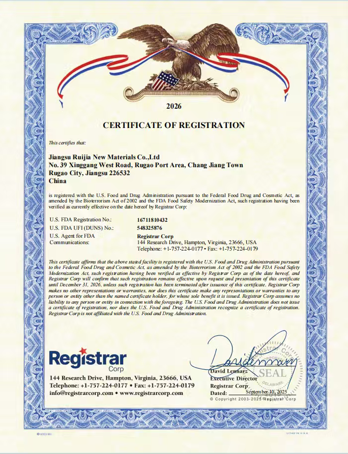 Jiangsu Ruijia Import and Export Co., Ltd. was established in 2014 as a wholly-owned subsidiary of Jiangsu Ruijia Food Ingredient Co., Ltd. Scope of business,Permitted Project: Business of Hazardous Chemicals (Projects that require approval must obtain the necessary approval from relevant authorities before operation. The specific business projects shall be subject to the approval results.) General business projects: Import and export of goods; Import and export of technology; Import and export agency (except for projects that require approval according to laws and regulations; conduct business activities independently in accordance with the business license)