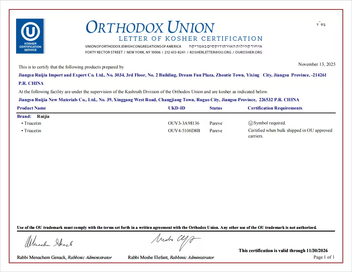 Jiangsu Ruijia Food Ingredient Co., Ltd. (Jiangsu Ruijia Chemistryl Co., Ltd.) was founded in 1981. As a former joint venture of China National Tobacco Corporation, Jiangsu Ruijia Food Ingredient Co., Ltd. currently is one of the largest manufacturers of triacetin in the world. Located on the shore of the beautiful Taihu Lake-Zhoutie Town of Yixing City in Jiangsu Province, Jiangsu Ruijia Food Ingredient Co., Ltd. is a high-tech enterprise integrating R&D, production and marketing, with multiple offices throughout the country, a trading subsidiary and more than 300 employees. Now, our company's products mainly include food additives, casting materials, basic chemicals, environmentally friendly plasticizers, etc., covering tobacco, food, flavors and fragrances, casting, coatings, inks, medicine,