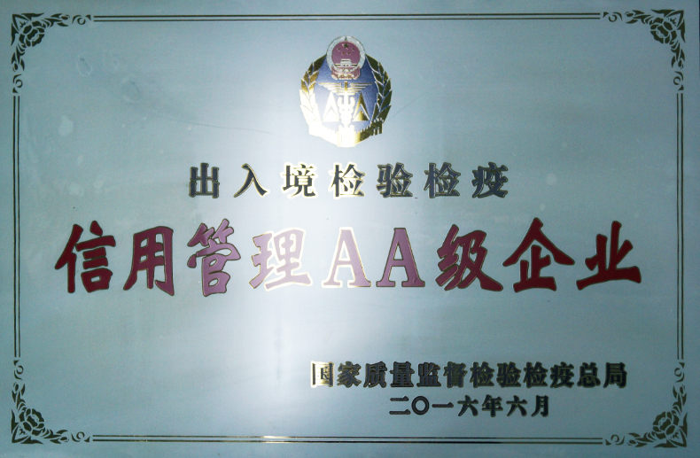 公司獲得出入境檢驗(yàn)檢疫信用管理AA級企業(yè)